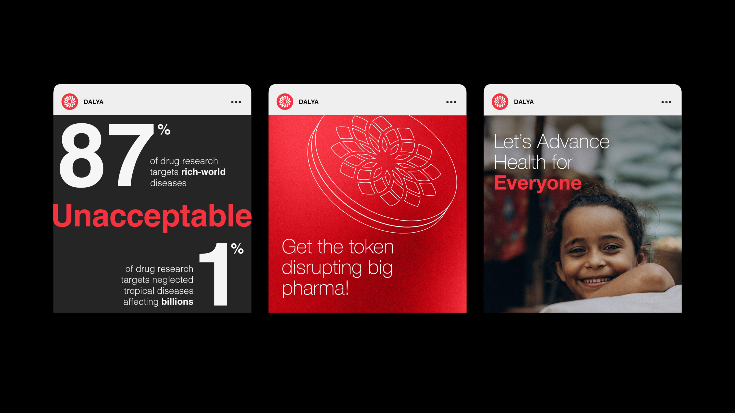 DALYA, a Decentralised Autonomous Organisation (DAO), aims to revolutionise drug development for neglected diseases. To convey immediacy, innovation, and community empowerment, DALYA sought a brand identity and strategy that resonated with the tech-savvy crypto community as well as the scientific and public health sectors.